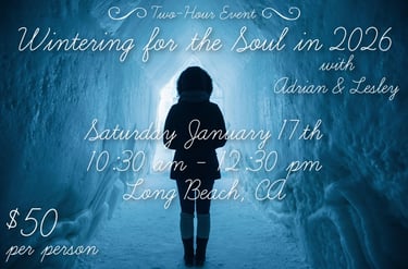 On Saturday, January 17th, 10:30 am to 12:30 pm, Adrian and Lesley will be facilitating a meditation and sound event called, “Wintering For the Soul In 2026.” This will be a TWO-HOUR event at our current community space, in Long Beach, to explore ways in which your soul is presently wintering. We will provide ample time for goal setting surrounded in a safe, light-hearted group of discussion and support, followed by a guided meditation to clear and amplify your energy centers, and a sound bath filled with light language and channeled transmissions to align with your goals and manifest these seeds of inspiration for the year to come.